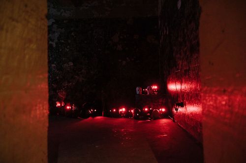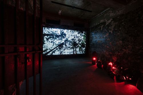 In contrast, Jones embraces the storm of information produced by lived experiences, news and current affairs in another time-based work presented in this survey. Hinohara-mura 2024, presents a perspective filmed during a residency with Tokyo University of theArts in the mountains of Hinohara-murawest of Tokyo, a place Jones recalls as “a very beautiful quiet experience”, after the adrenaline rush of the capital. A frenetic drumming rhythm and the artist’s stream of consciousness manifested in spoken word poetry accompanies the meditative visual, a soundtrack collaboration featuring percussionists Tim Bruniges, Dhara Cullen and Darren Seltmann. Arranged around the cell are skull-like ceramic sculptures (RiverStyx 2024-25), some emitting a ghostly red light, which, for the artist, offer a visceral confrontation with morality and the enduring weight of human history.