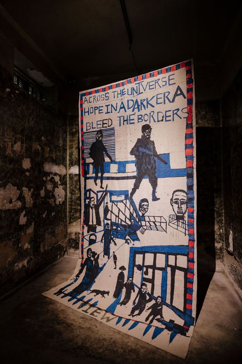 In his writing, New York Times correspondent Mujib Mashal describes “taking in the end of one era and the fearful start of another”, as he writes on the eve of the fall of Kabul to the Taliban. After decades of violence and cycles of false hope, Mashal laments the despair filling manyAfghans in the face of a dreaded future.Similarly, Uncertain Future 2021, compiles the headlines of its time, incorporating the artist’s firsthand experiences of climate catastrophe, the COVID-19 pandemic, and his research travels in the Middle East.The words and imagery inscribed serve as markers, amongst an almost-blackdeep indigo ink spreading across the paper; the permanence of its sticky gloss binding global timelines and sentiments.Suspended within one of the smallest male cells, Uncertain Future consumes the space and compels viewers into close engagement with its details, a snapshot of a moment in time.