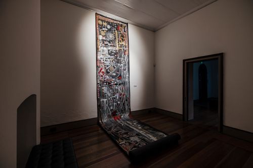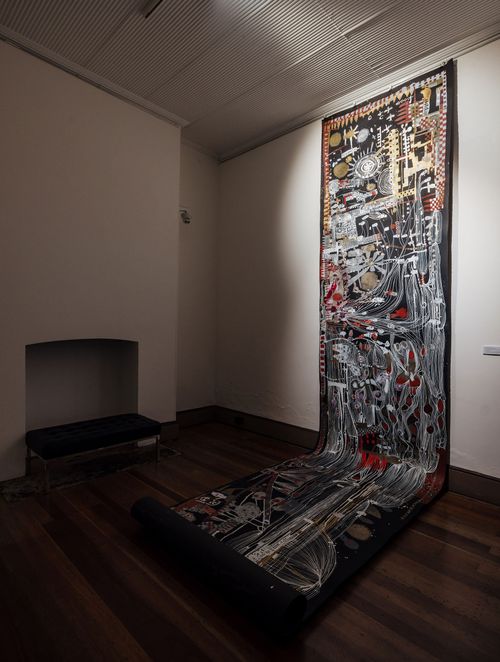 The work, To bear witness 2024-25, a drawing rendered in ink and Conté by LocustJones cascades from the ceiling, heralded by a chequered red and silver border from which toothlike bullets emerge. Within this ominous frame, three fighter jets flyin formation while skyscrapers tremble and golden sunbursts erupt all around. As events unravel through the panoramic drawing, symbols emerge: helicopter rotor blades, crosses and tortured faces extrude from the rubble, mingling with the network of white veins that map them together in a requiem for souls lost. Veins thread further downward as the timeline unravels and consumes the paper, forming structures and interstices, transforming the scroll into a complex, multicellular organism.