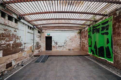 The titular work, The green dream 2024, hovers in the company of four other unstretched canvases in the formerExercise Yard; a vibrantly chromatic counterpart in this survey of Locust Jones’ practice. Cubes of recycled hardwood(Ring Cycle 2025) sourced from a local arborist complete the arrangement, inviting viewers to rest upon them and reset, contemplating the interplay of thought and artefact, the private and the public, the ephemeral and the eternal.
